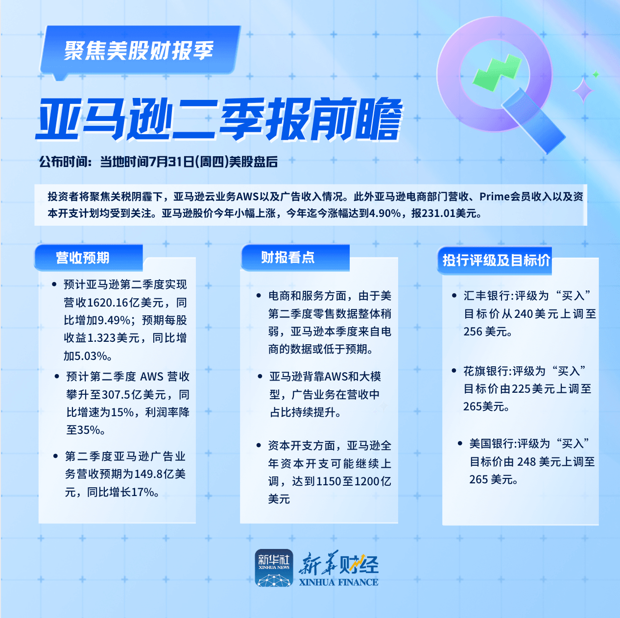 对亚马逊来说,投资者将聚焦关税阴霾下,亚马逊云业务AWS以及广告收入情况。此外亚马逊电商部门营收、Prime会员收入以及资本开支计划均受到关注。