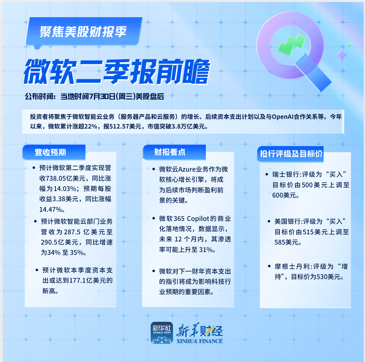 微软今年股价持续攀升,市值突破3.8万亿美元。投资者将聚焦于微软智能云业务(服务器产品和云服务)的增长、后续资本支出计划以及与OpenAI合作关系等。