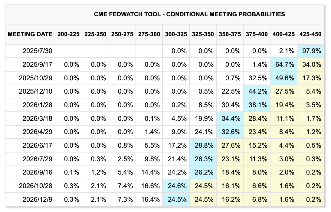 但7月会议纪要中美联储对后续政策路径的信号对投资者至关重要,9月的议息会议会否成为今年美联储政策转向的重要窗口?根据芝商所美联储观察工具,目前市场预期美联储7月维持利率不变的可能性为97.9%,9月降息25个基点的可能性为64.7%,10月降息25个基点的可能性达到49.6%。