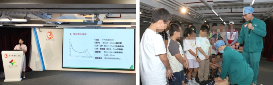 两场“案例教学+实景模拟”的科普讲座同样干货满满。《解锁儿童生长密码:规律评估避误区》讲座通过动态生长曲线演示,帮助家长破解发育评估误区;《“救”在身边:儿童家庭急救必修课》则通过模型演示“心肺复苏法”,并现场开展互动实操,让家长们直呼“这些救命技能太实用了!”